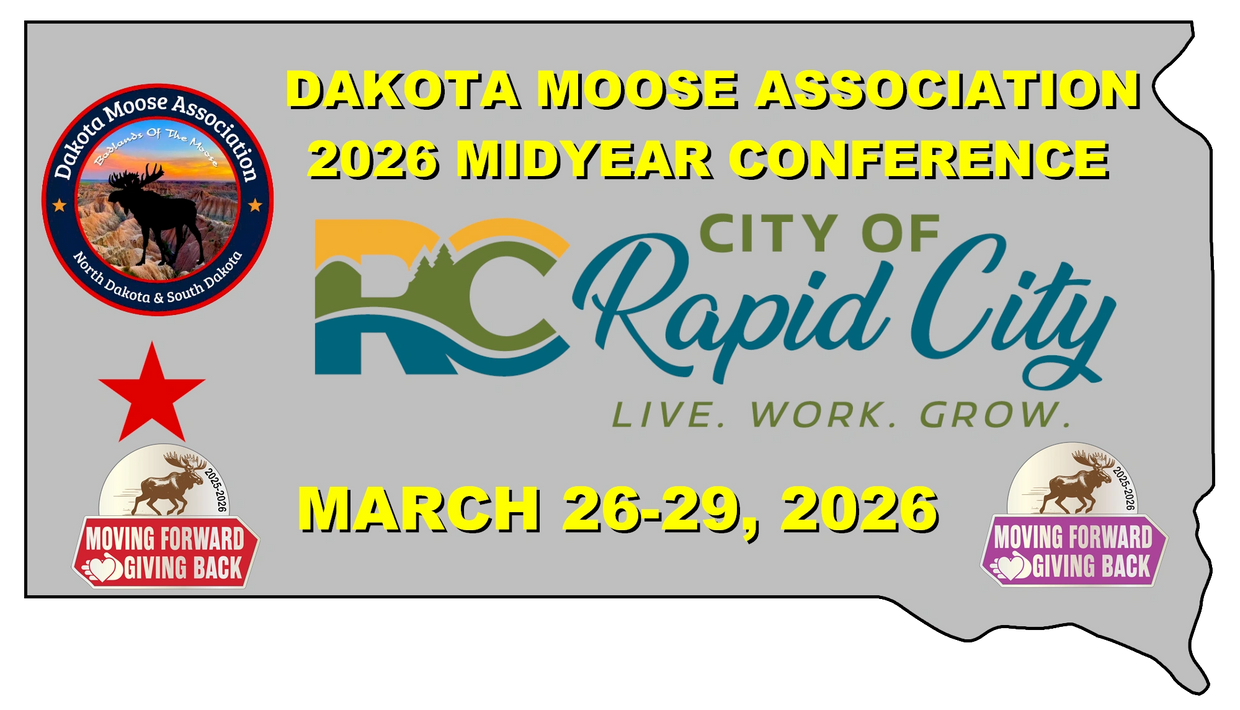 The Dakota Moose Association 2026 Midyear Conference will be held in Rapid City, South Dakota, at Rapid City Moose Lodge 1137 on March 26-29, 2026. Information is posted below.